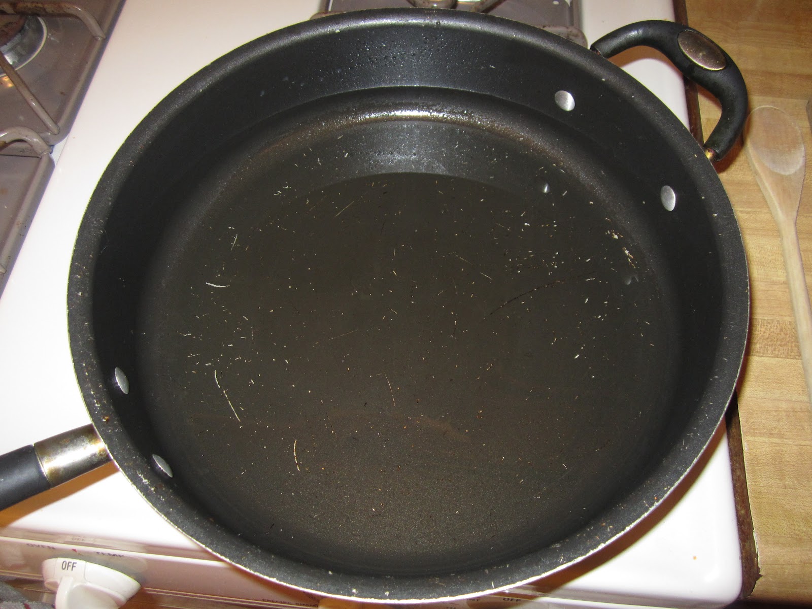 Turn on large pan to medium high heat Pour in olive oil to cover the bottom of the pan |